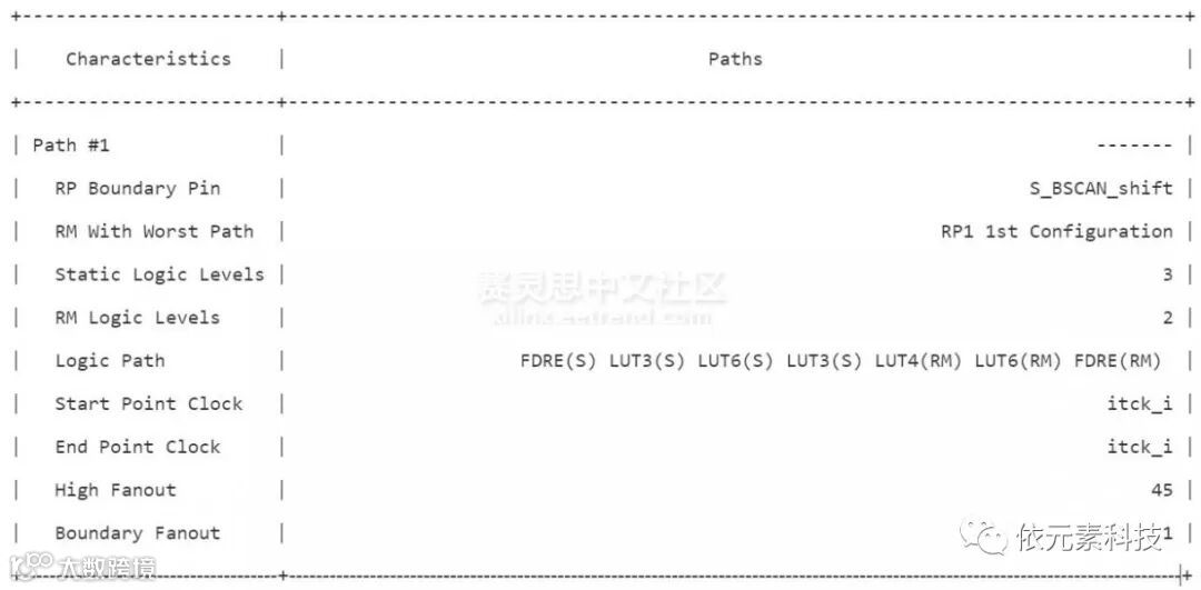 -timing操作会在逻辑层分析RP边界最差的接口路径,默认会检查10个最差的路径,可以使用-nworst来改变设置,下表中Logic Path显示的是逻辑层并且定义每层属于静态(S)分区还是可重配置(RM)分区,下面是三个边界路径分析示例:
