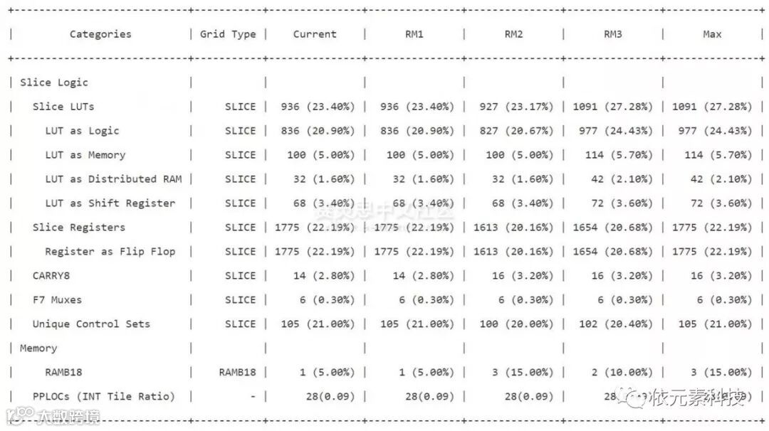 注意RM1需要最多的资源用于实现Slice寄存器,RM2需要最多的BlockRAM资源,RM3需要最多的Slice LUTs资源。每种资源类型的最大值汇总在MAX这一列中——这一列应用用于规划pblock资源大小,记住额外的开销是建议性的——指定可重配置分区的打包密度与完整性设计类似。