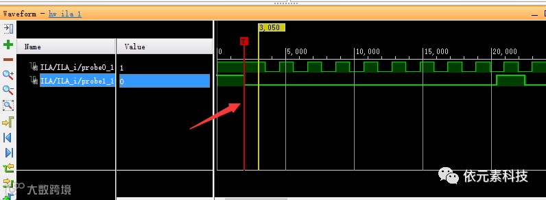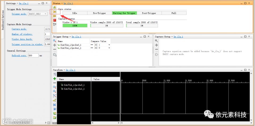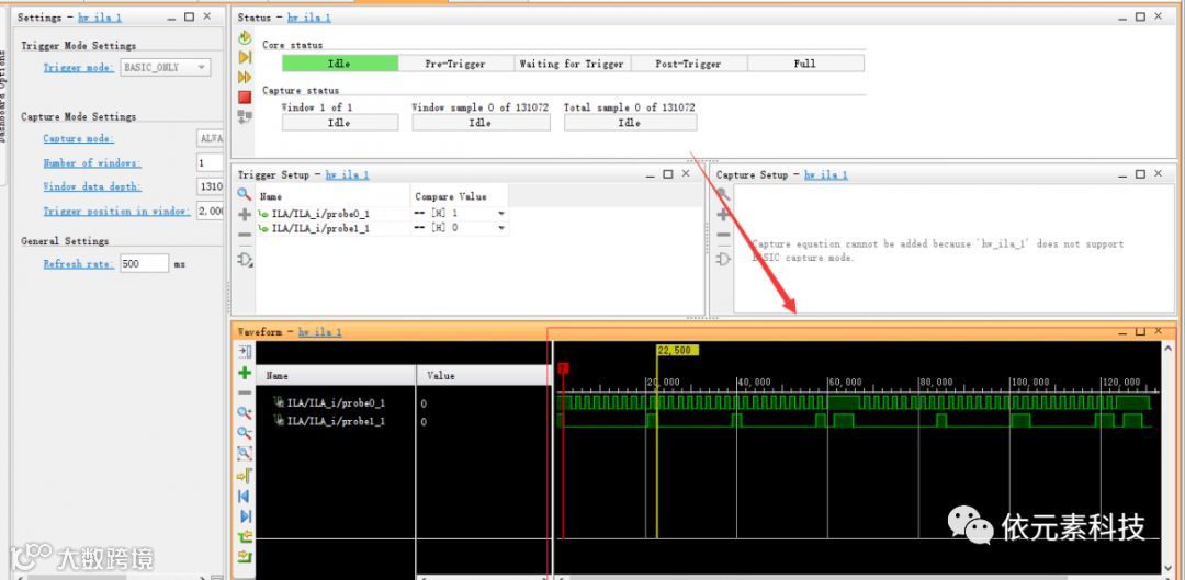 在hw_ILA界面,将ila的信号探针数据加入Trigger setup和waveform中。只要在