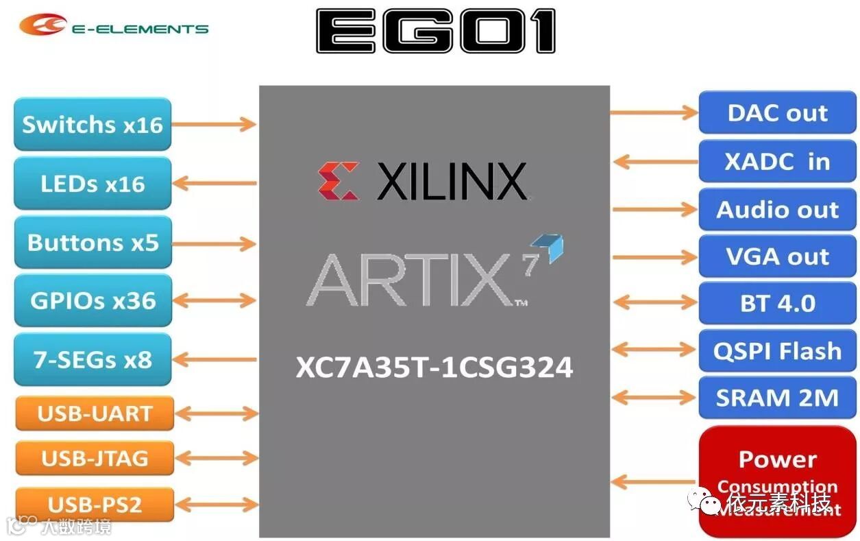 EGO1采用了Xilinx Artix-7系列XC7A35T FPGA芯片。同时,提供了丰富的拨码开关与LED,外设功能部份有音频、蓝牙、XADC/ DAC、SRAM等功能,使EGO1的用户可以得到一个性价比更高、资源更丰富的FPGA平台,为众多FPGA的学习者在此平台中可以做到更多的扩展与设想。另外,EGO1还隐藏了一个功耗测试的彩蛋,让设计者可以实测出自身设计的实际功耗。