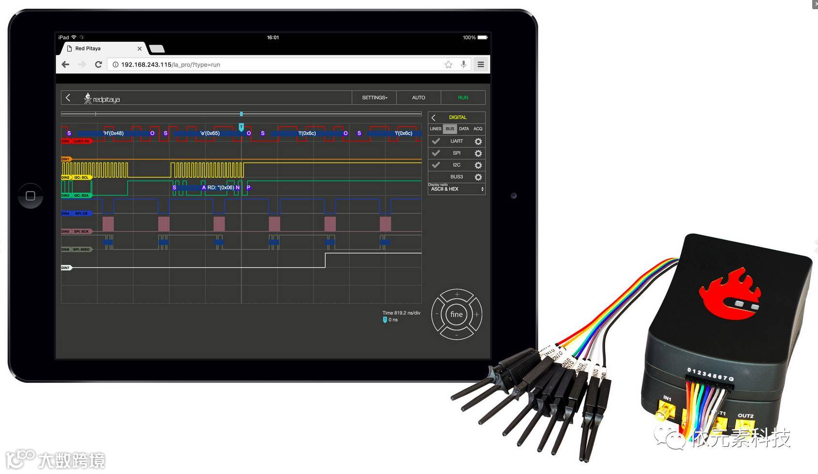 逻辑分析仪应用将您的火龙果实现成一个可以显示数字信号的低成本逻辑分析仪,既可以处理纯二进制信号,例如Raspberry Pi或Arduino板的GPIO输出,也可以分析不同的总线(I2C,SPI和UART)并对总线上传输的数据进行解码显示。