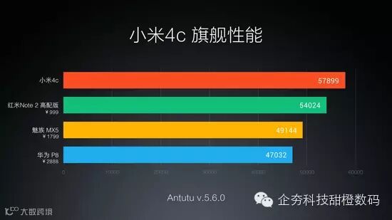 雷军表示,小米4c搭载的高通骁龙808 64位6核处理器,实际跑分达到57899分,比魅族MX5 华为P8的还要高。同时雷军还强调跑分不是体验的全部,但跑分是基础(似乎在跟黄章隔空对话)。