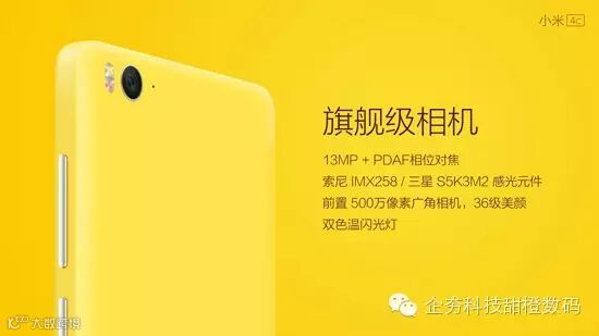 相机方面,小米4c采用了前置500万像素+后置1300万像素摄像头组合。后置1300万像素摄像头采用了骁龙810同级别ISP影像处理器,支持阳光屏技术拍照,暗光画质增强,快慢动作录像。前置则为85°广角镜头,支持36级实时智能美颜。