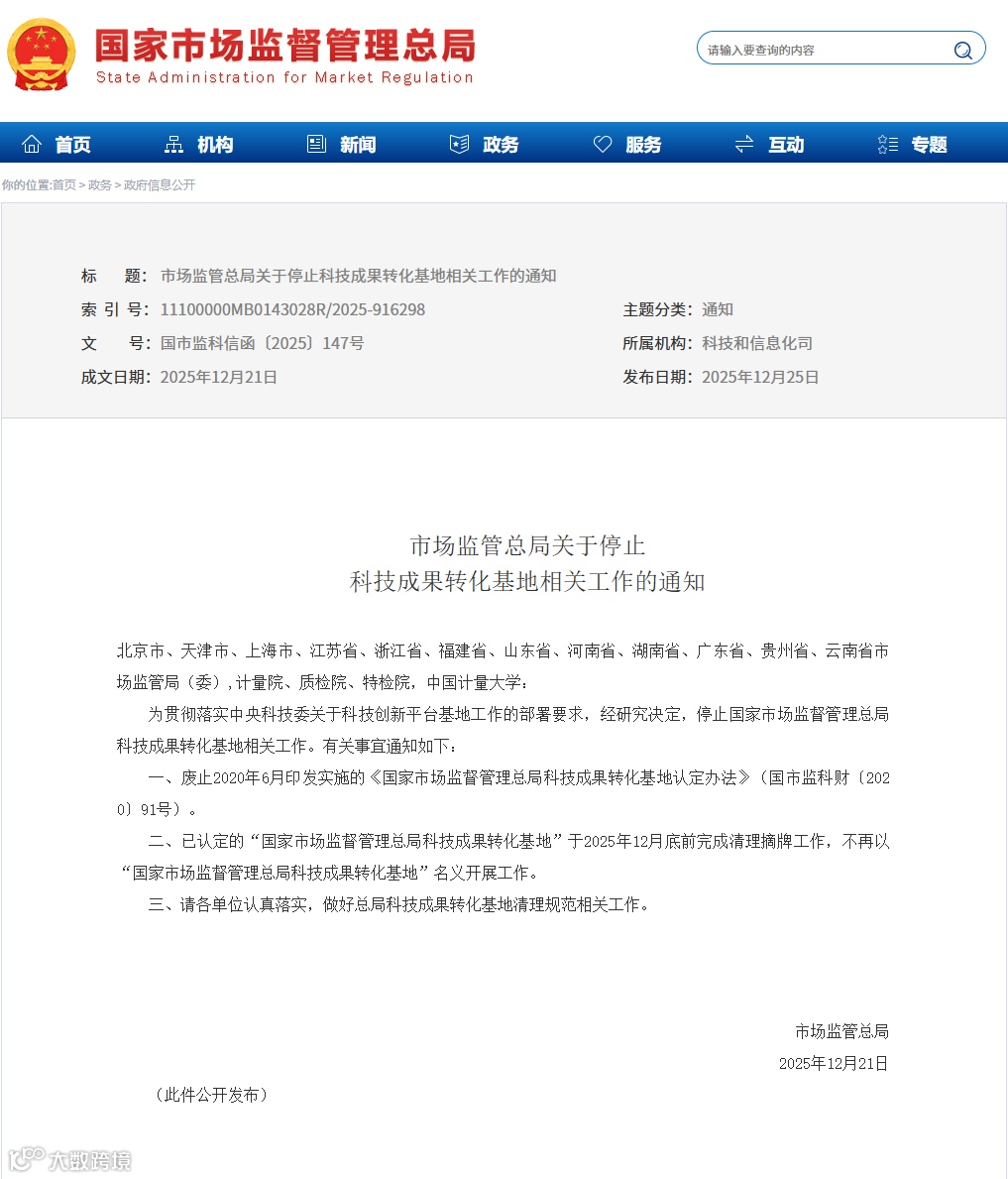 二、已认定的“国家市场监督管理总局科技成果转化基地”于2025年12月底前完成清理摘牌工作,不再以“国家市场监督管理总局科技成果转化基地”名义开展工作。