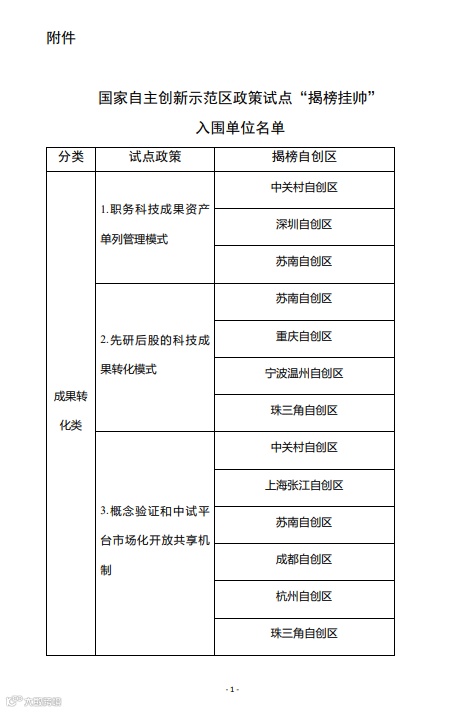 为贯彻落实党中央、国务院决策部署,推动国家自主创新示范区(以下简称自创区)进一步全面深化改革,更好发挥先行先试作用,工业和信息化部联合科技部组织开展自创区政策试点“揭榜挂帅”工作。经专家论证和遴选,确定了自创区政策试点“揭榜挂帅”入围单位名单,现予以公布,有关事项通知如下。