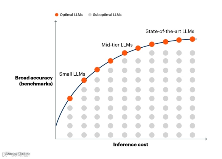 闫斌展示了一幅关于大模型如何选择的曲线图,图中横坐标代表模型规模增大或推理成本提高,纵坐标表示准确度提升。所有模型大致符合这样一条曲线:随着模型增大,能力变强。然而,其投入产出比不成正比,投入增加但能力增长呈现疲态。因此,对于企业而言,应在这条曲线上选择合适的模型,比如小模型或中等规模的模型,以实现最佳效益。