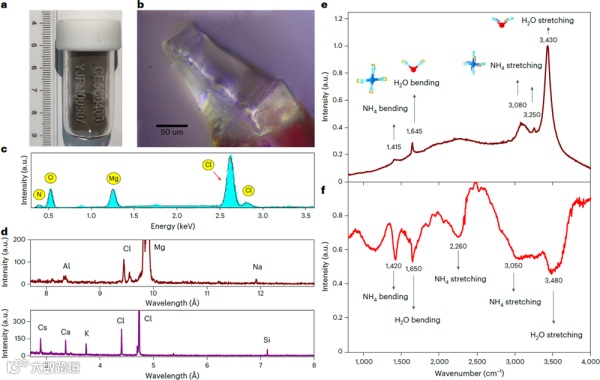 ▲富含水分子和铵的未知矿物晶体——ULM-1和成分组成