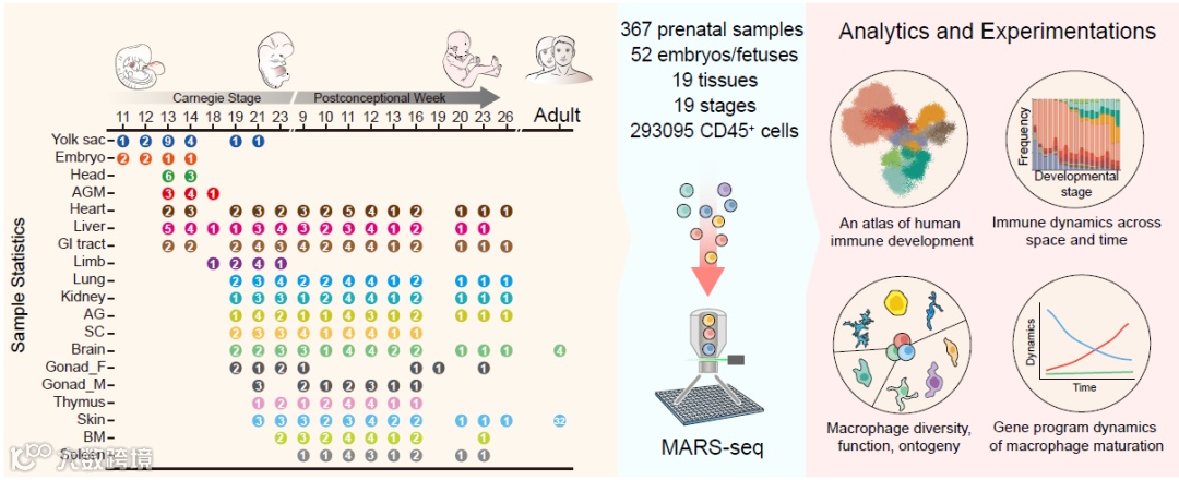 在这项研究中,科研人员利用自动化、高通量的合成生物研究大科学装置,自主搭建单细胞转录组测序平台,对发育中的免疫细胞开展“解码”,并以这样的海量数据为基础绘制人体免疫系统发育图谱。