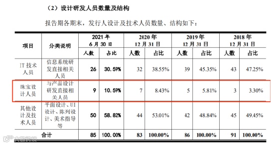 但数据显示,2021年上半年,该公司的珠宝设计人员仅有9人,主要通过聘请外部设计团队研发、合作厂商选款等方式进行新品研发。2021年上半年,公司34个新增款式中,内部设计师设计的数量仅为2款,其余皆为合作厂商设计。