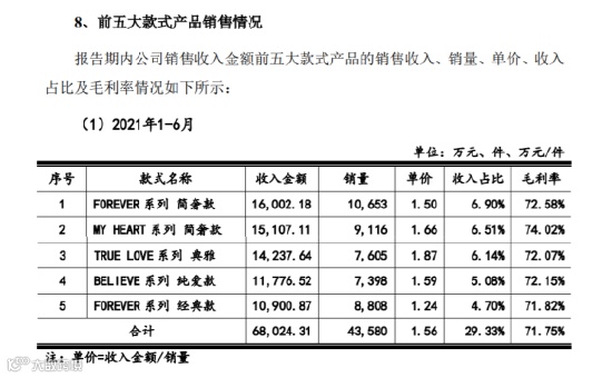 从具体产品的毛利率来看,2021年上半年,其销售收入排名第一的产品为FOREVER系列简奢款,成本仅为4000元左右,售价却高达1.5万元,毛利率超过72%。