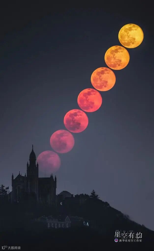 这是上海市天文爱好者申然2022年1月18日在上海佘山拍摄的满月月升串像(多张叠加)。星联CSVA/图