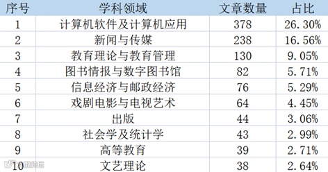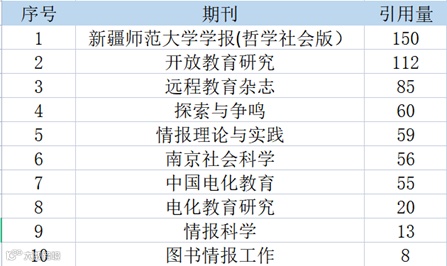 从期刊分布来看,发文数量排在前10名的期刊有:《探索与争鸣》、《远程教育杂志》、《开放教育研究》、《中国电化教育》、《情报理论与实践》、《新疆师范大学学报(哲学社会版)》、《南京社会科学》、《电化教育研究》、《图书情报工作》和《情报科学》。
