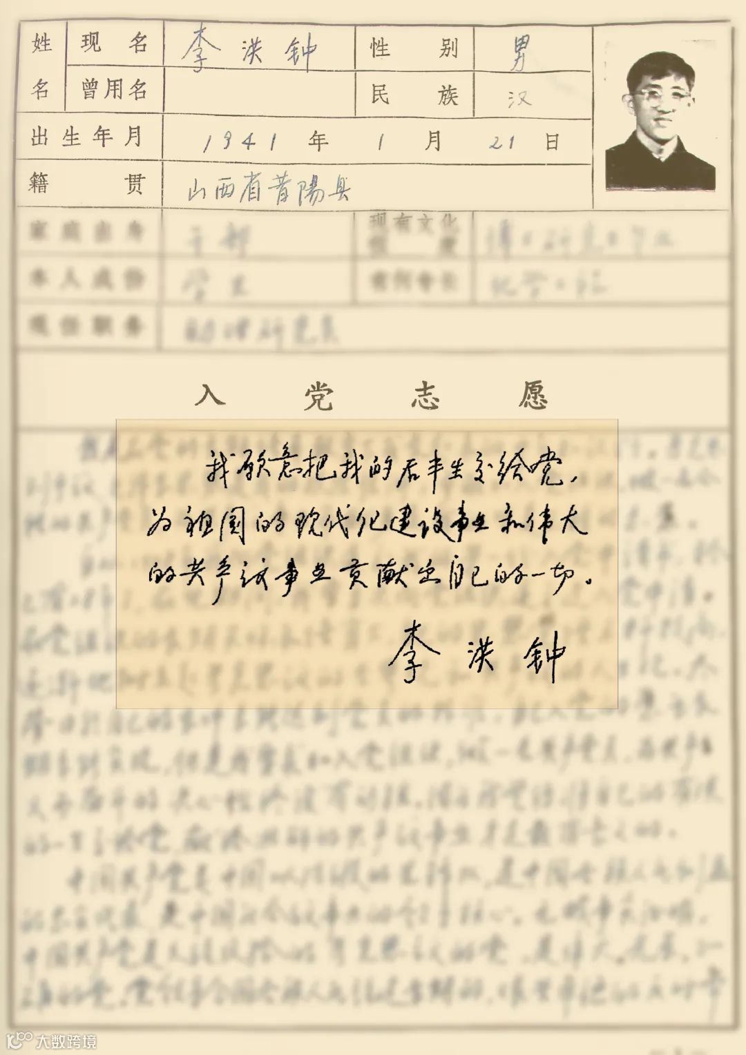 我愿意把我的后半生交给党,为祖国的现代化建设事业和伟大的共产主义事业贡献出自己的一切。——摘自李洪钟1985年6月《入党志愿书》