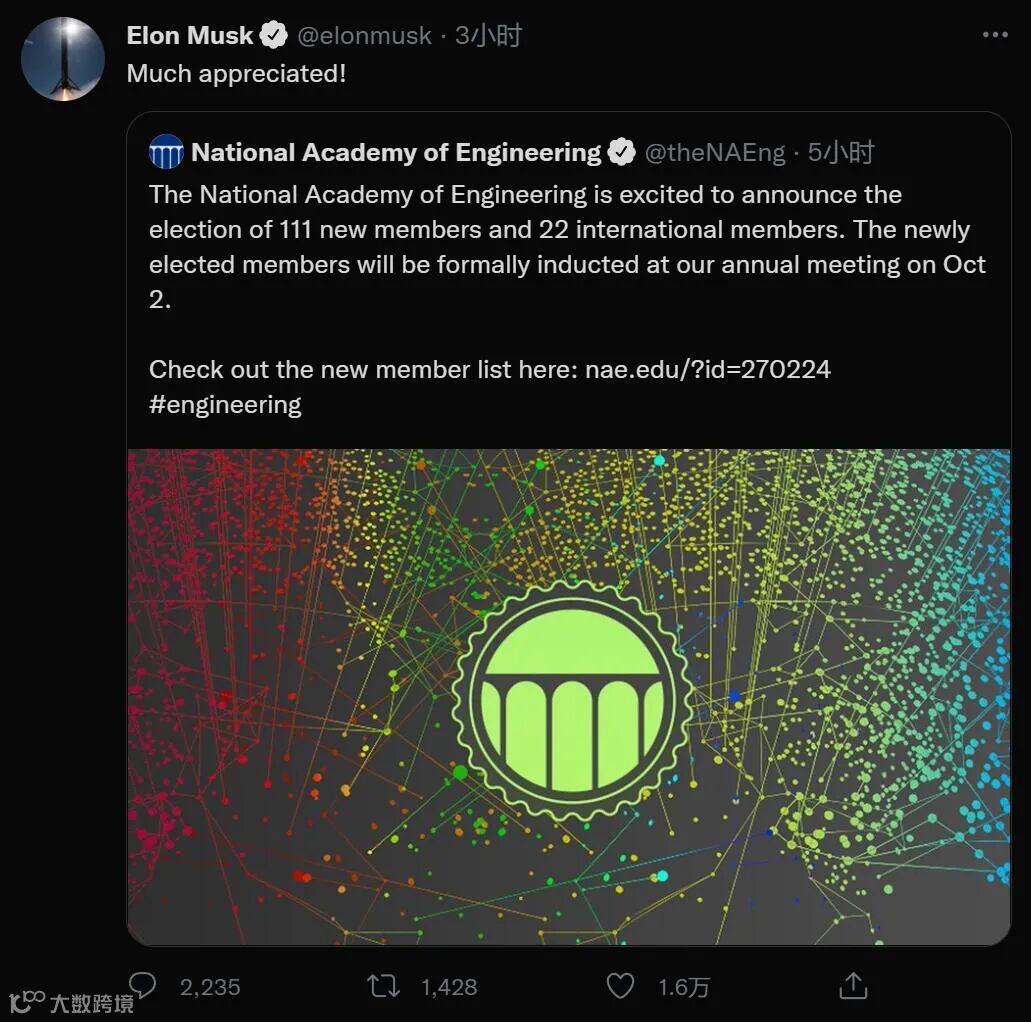消息公布后马斯克在社交网络中表示感谢