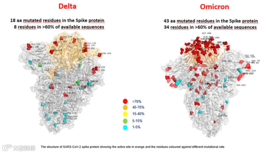 德尔塔毒株与奥密克戎毒株刺突蛋白突变对比图。图源:罗马儿童医院