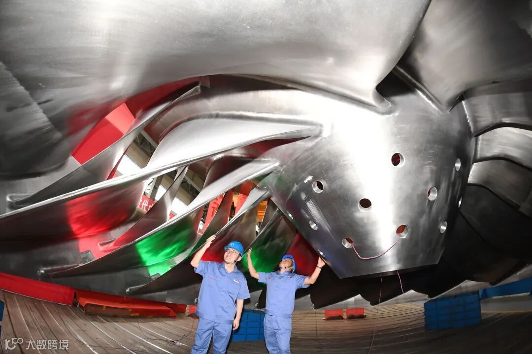 而后,哈电集团继续实施精细化工程控制,全工序提升制造精度,通过改进焊接工序,使白鹤滩转轮焊缝一次交检合格率大幅提升;专有的长短轴翻身技术,避免了翻身时对转轮尺寸产生不利影响;特有的热处理支撑工具,确保转轮在580摄氏度高温下不变形;先进的光学数字测量技术,使转轮叶片安放角度偏差控制在±0.5°以内,精度提升2倍以上。哈电集团研制的白鹤滩转轮直径8.87米、高3.8米,总重338吨,全部达到或优于精品标准,第三台更是创下全球首个巨型长短叶片转轮“零配重”的突破性业绩,堪称打造了一颗白鹤滩水电机组的“天然无瑕心脏”。