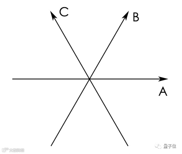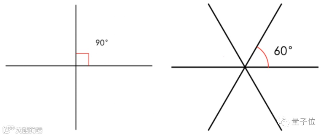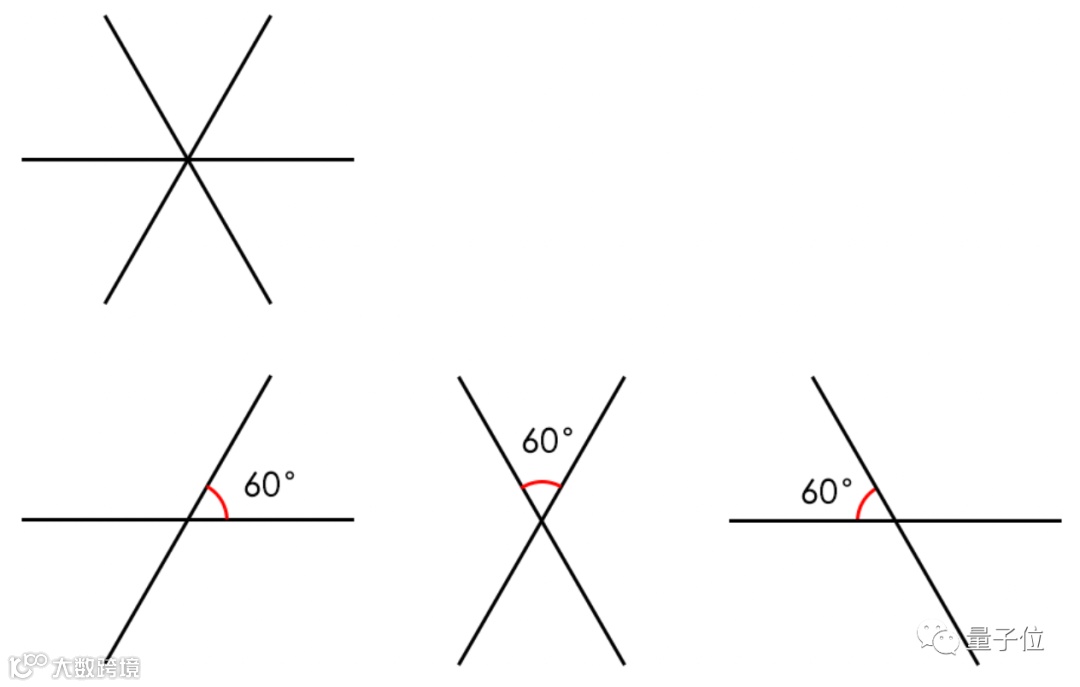 3条直线形成的6个60度夹角,也刚好把一个二维空间分成6部分,合起来就是360度。