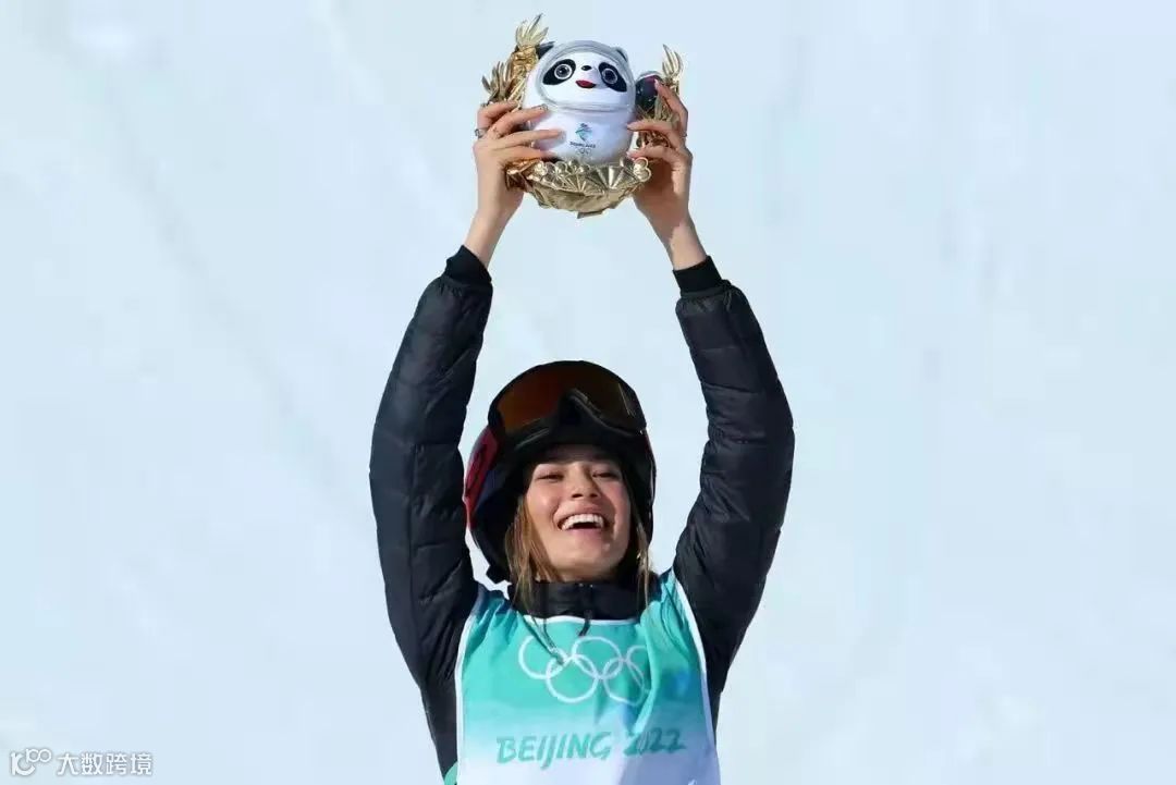 谷爱凌高举“冰墩墩”庆祝