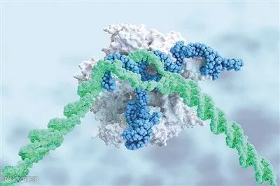 CRISPR-Cas9复合物(白色和蓝色)可以切割DNA(绿色),使导致疾病的基因失效。图片来源:《自然》网站