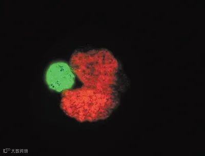 AI设计的吃豆人形状的“母体”生物(红色),旁边是被压缩成球状的干细胞——“后代”(绿色)。