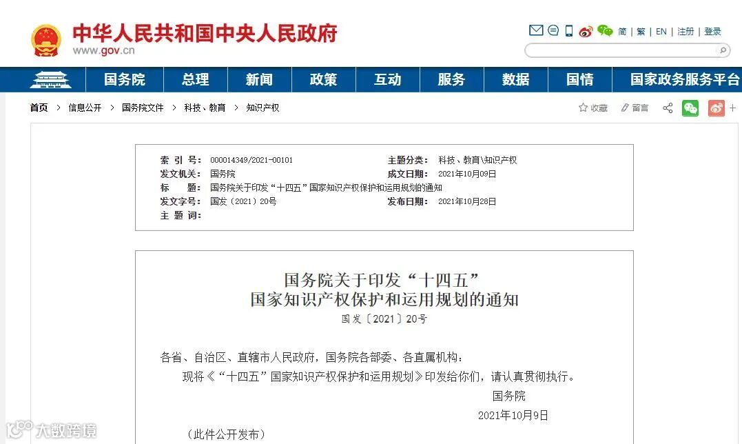10月28日,国务院印发《“十四五”国家知识产权保护和运用规划》提出,到2025年,知识产权强国建设阶段性目标任务如期完成,知识产权领域治理能力和治理水平显著提高,知识产权事业实现高质量发展,有效支撑创新驱动发展和高标准市场体系建设,有力促进经济社会高质量发展。