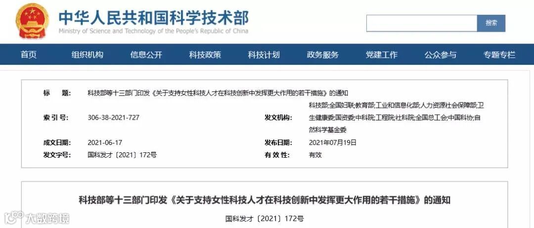 7月19日,科技部官网公布《关于支持女性科技人才在科技创新中发挥更大作用的若干措施》(以下简称《若干措施》)。明确在“十四五”和今后相当长时期内,要坚持性别平等、机会平等,为女性科技人才成长进步、发挥作用创造更好环境,努力造就一批具有世界影响力的顶尖女性科技人才。