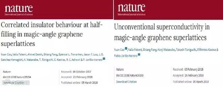 2018年,曹原以第一作者身份在《Nature》上连发两篇文章,发现当两层平行石墨烯堆成约1.1°的微妙角度,赋予石墨烯超导能力的“魔角”,从而引发奇特的超导效应,《Nature》连发两篇关于转角石墨烯的重大成果,并配以评述。国内外学术界为之震动,开辟了凝聚态物理的新领域。
