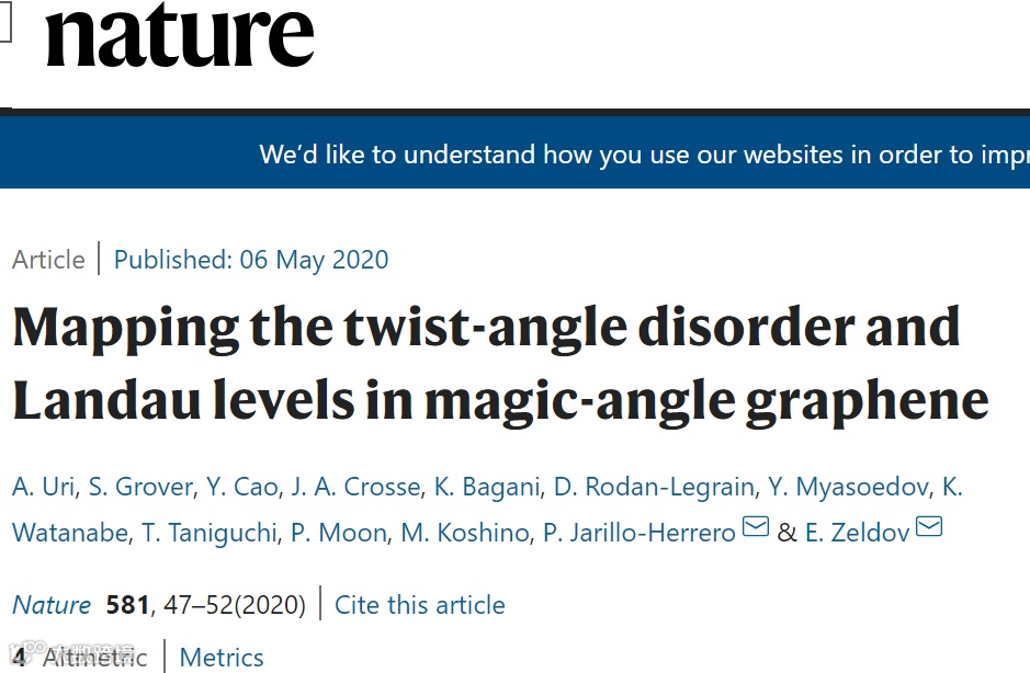 另一篇Nature论文中,曹原团队致力于研究扭曲角的分布信息。他们以六方氮化硼(hBN)封装的MATBG为研究对象,使用纳米级针尖扫描超导量子干涉装置(SQUID-on-tip)获得处于量子霍尔态的朗道能级的断层图像,并绘制了局部θ变化图。该设备的相对精度达到0.002度,空间分辨率为几个莫尔周期。