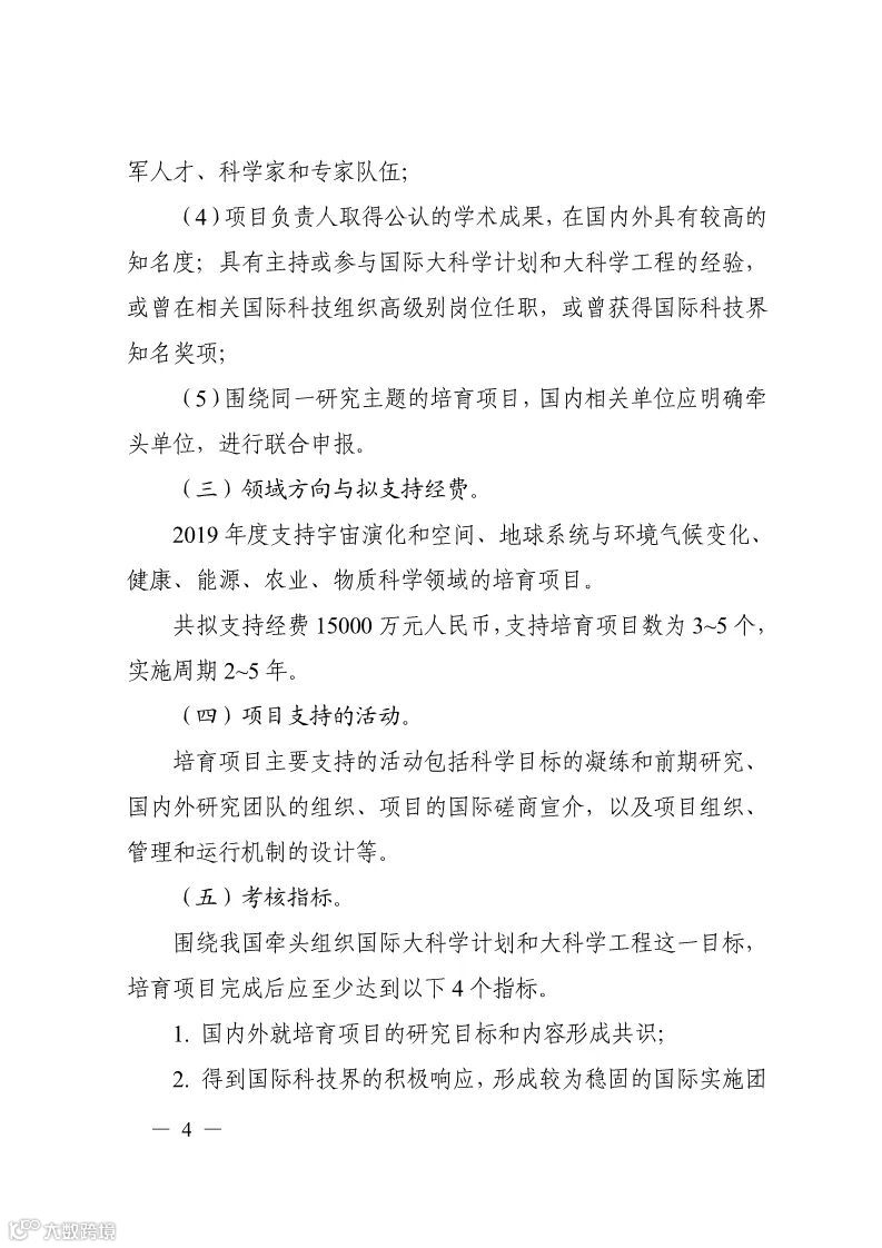 指南显示,2019年度支持宇宙演化和空间、地球系统与环境气候变化、健康、能源、农业、物质科学领域的培育项目。共拟支持经费15000万元人民币,支持培育项目数为3~5个,实施周期2~5年。