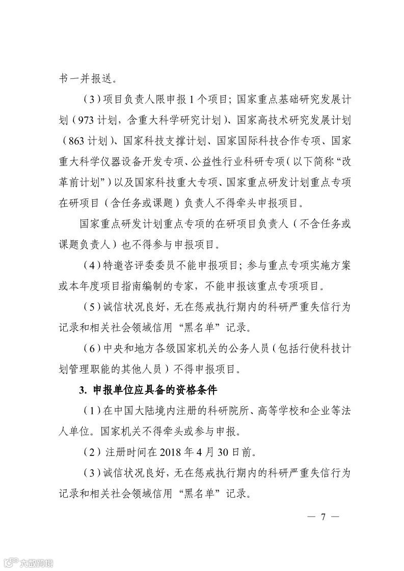 4. 项目负责人限申报1个项目;国家重点基础研究发展计划(973计划,含重大科学研究计划)、国家高技术研究发展计划(863计划)、国家科技支撑计划、国家国际科技合作专项、国家重大科学仪器设备开发专项、公益性行业科研专项(以下简称“改革前计划”)以及国家科技重大专项、国家重点研发计划重点专项在研项目(含任务或课题)负责人不得牵头申报项目。国家重点研发计划重点专项的在研项目负责人(不含任务或课题负责人)也不得参与申报项目。