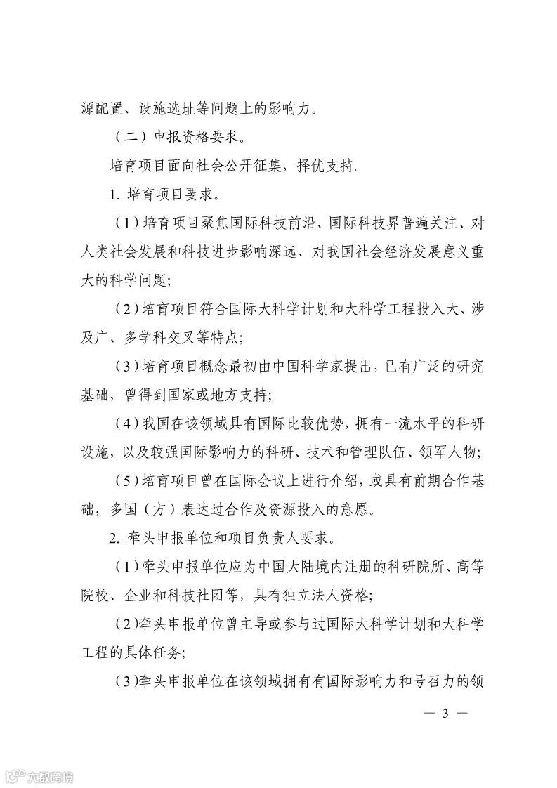 指南要求,培育项目概念最初由中国科学家提出,已有广泛的研究基础,曾得到国家或地方支持;我国在该领域具有国际比较优势,拥有一流水平的科研设施,以及较强国际影响力的科研、技术和管理队伍、领军人物;培育项目曾在国际会议上进行介绍,或具有前期合作基础,多国(方)表达过合作及资源投入的意愿。