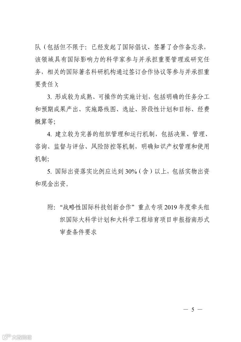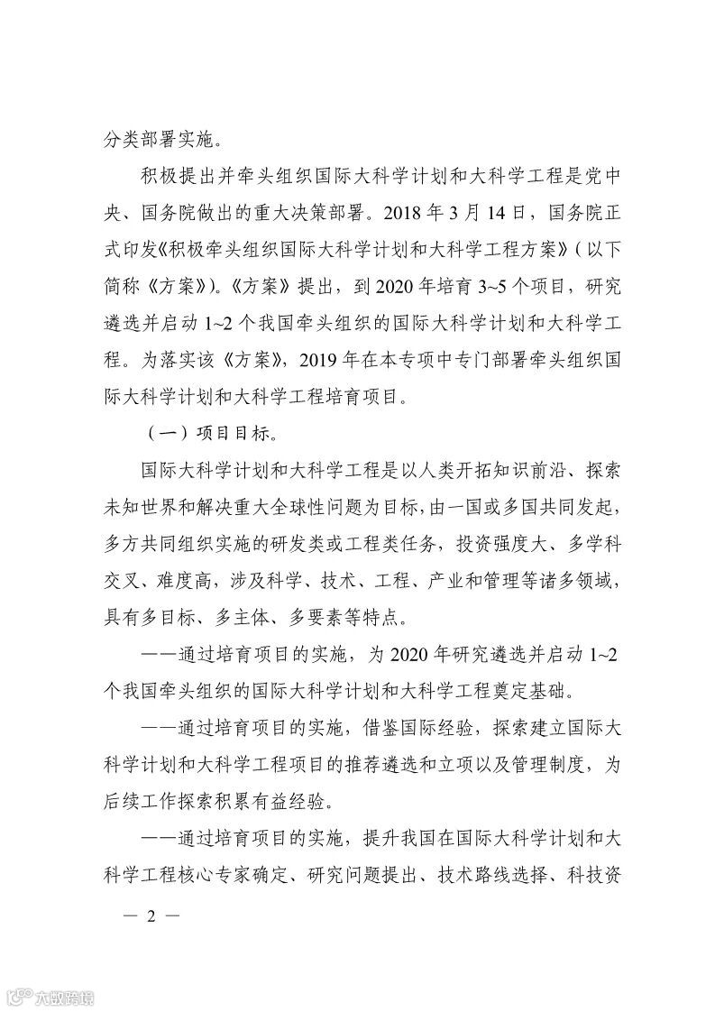 科技部关于发布国家重点研发计划“战略性国际科技创新合作”重点专项2019年度牵头组织国际大科学计划和大科学工程培育项目申报指南的通知