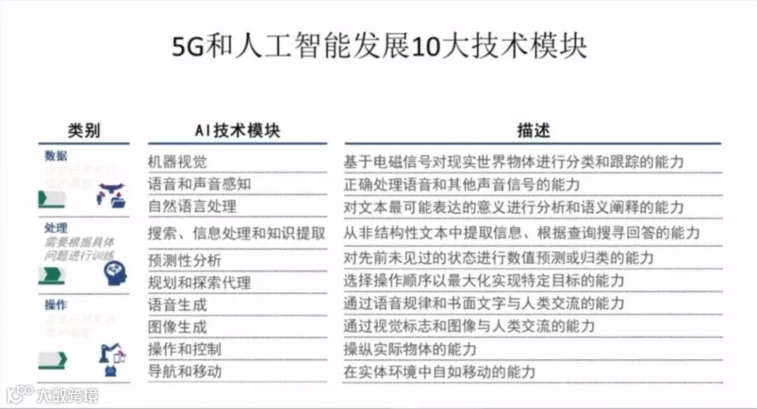 第一类数据模块,包括机器视觉、语音和声音感知、自然语言处理,现在走得很快。第二类处理模块,包括搜索、信息处理和知识提取,预测性分析,规划和探索代理。第二类操作模块,包括语音生成、图像生成、操作和控制、导航和移动。
