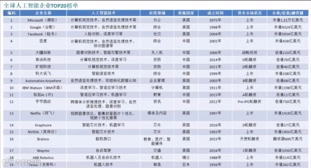 最近发布了全球人工智能企业的前20家的排名。大家可以看到,在20家的排名里,美国是8家,包括微软、谷歌。中国是7家,包括百度、大疆、商汤、旷视、科大讯飞、字节跳动等等。