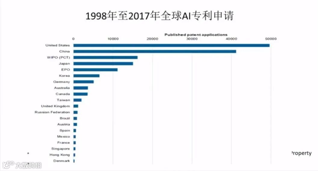 我们把1998年到2017年的全球AI专利的申请,我们做了一个图表,我们可以看到美国还是领先,大概有4万9千例左右,但与中国比,领先优势并不大。中国已经占到了4万2千例不到,离美国也就差一点点。所以,中国的专利研究和专利水平已经在走上世界水平。