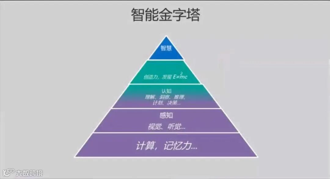 我们做了一个智能的金字塔,在底层的是计算和记忆力,现在基本都已经是计算机化了。另外,人的基本功能如感知、视觉和听觉,我们现在已经基本全部数字化。语音识别、头像识别、人脸识别就人的基本功能,现在计算机已经做完了。