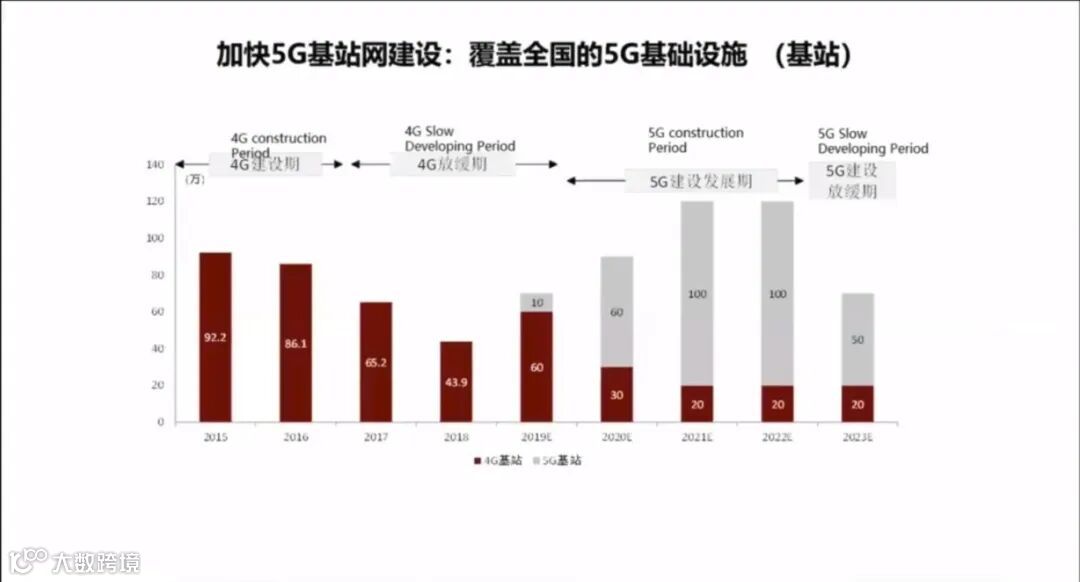 棕色的是4G的基站铺设,大家可以看到一个基站完成大概要花5年的时间。中国现在是370万个4G的基站,占全球4G基站的51%左右,中国是全球的一个最主要的4G国家。