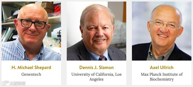来自美国基因泰克公司(Genentech)的 H. Michael Shepard,来自美国加州大学洛杉矶分校(University of California, Los Angeles)的 Dennis J. Slamon 和来自德国马克斯·普朗克生物化学研究所(Max Planck Institute of Biochemistry)的 Axel Ullrich(也曾是基因泰克的科学家)获得 Lasker~DeBakey 临床医学研究奖。