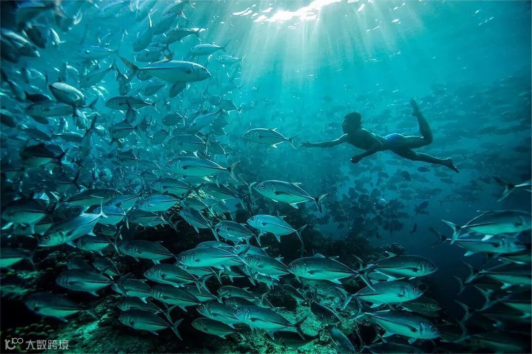 巴瑶族一名自由潜水员同一群狗鱼在游水。