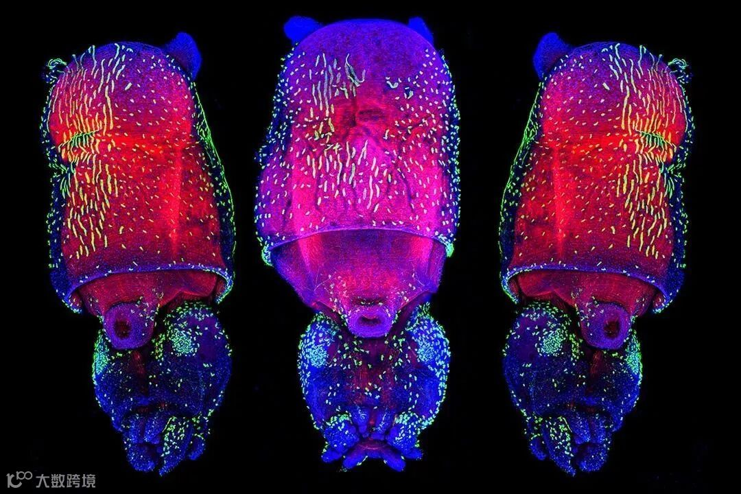 美国伍兹霍尔海洋生物学实验室的学生利用多种染色剂,展示了拥有精致构造的幼年枪乌贼体内的这些特殊细胞。