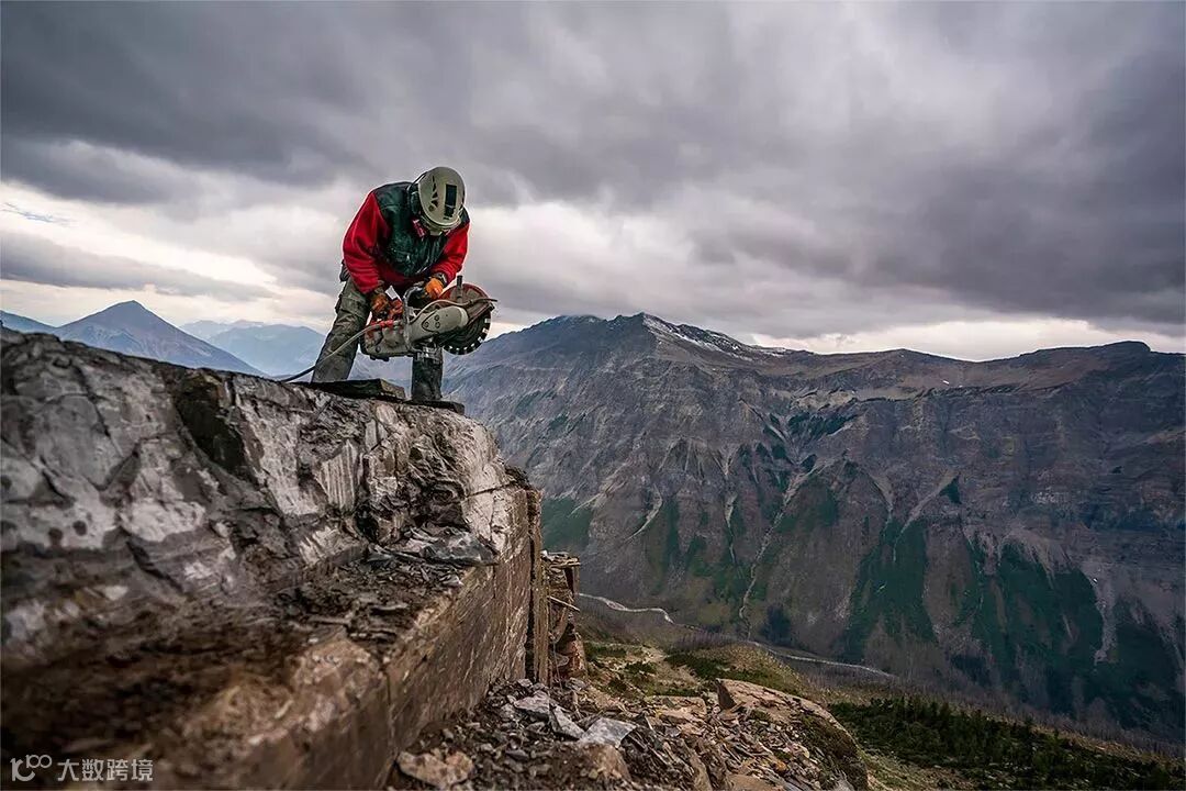 在加拿大库特尼国家公园,一名古生物学家利用一把切石锯移除可追溯至5亿年前的寒武纪化石。