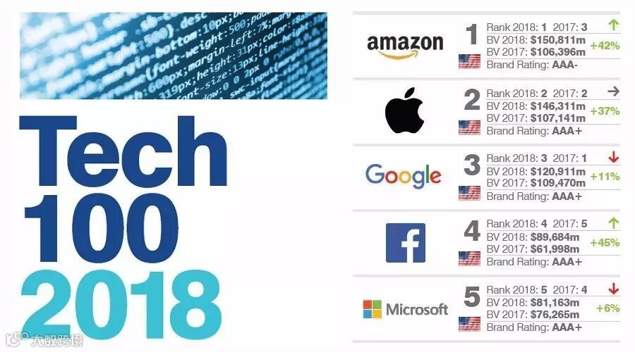 亚马逊跃升至第一位,品牌价值1508.11亿美元,比上年增长了42%。苹果仍然名列第二位,品牌价值1463.11亿美元,比上年增长了37%。谷歌从去年的第一名下滑至第三位,品牌价值1209.11亿美元,比上年增长了11%。亚洲地区价值最高的品牌是韩国的三星电子,以777.44亿美元的价值名列第六位。