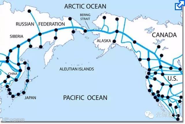 中美洲海底高铁线路从东北出发一路向北,先经西伯利亚抵达白令海峡,再从海底隧道穿越太平洋,抵达阿拉斯加。之后再前往加拿大最终抵达美国。