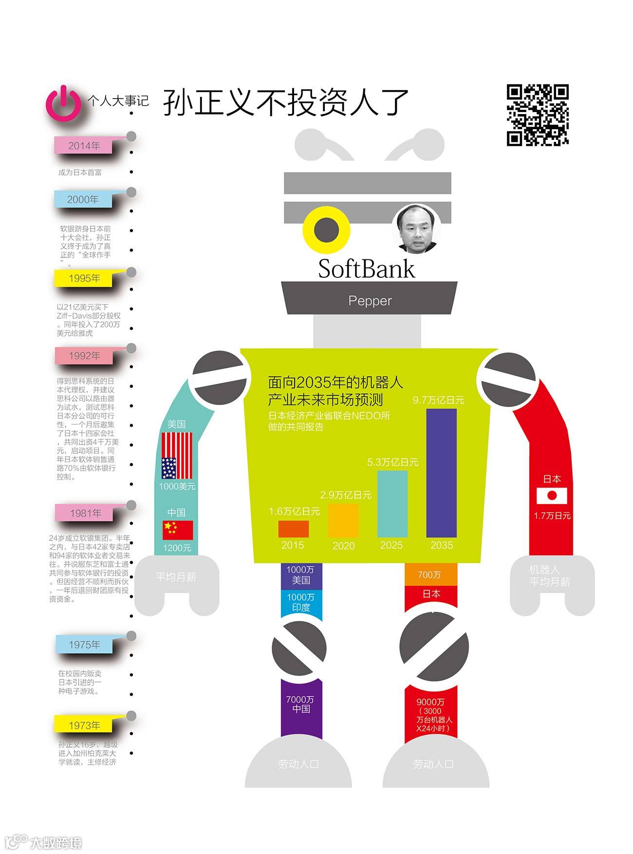 投资人孙正义开始投资机器人,在未来,机器人可能作为劳动力而取代人的工作。孙正义的眼光一向独到,不知这次的风向将会往哪吹?