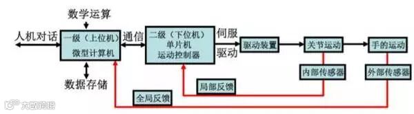 然后进行运动学、动力学和插补运算,最后得出机器人各个关节的协调运动参数。这些参数经过通信线路输出到伺服控制级,作为各个关节伺服控制系统的给定信号。关节驱动器将此信号D/A转换后驱动各个关节产生协调运动。 传感器将各个关节的运动输出信号反馈回伺服控制级计算机形成局部闭环控制,从而更加精确的控制机器人手部在空间的运动。