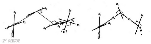 通常空间定位需要6个自由度,利用附加的关节可以帮助机构避开奇异位形。下图为7自由度操作臂位形