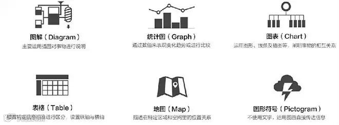 信息图的分类有很多种,各分类之间也并不是泾渭分明,所以大可不必纠结什么样的分法最正确,在木村博之所著的《图解力》一书中,他将信息图分为六大类:图 解(Diagram)、图表(Chart)、表格(Table)、统计图(Graph)、地图(Map)、和图形符号(Pictogram)。