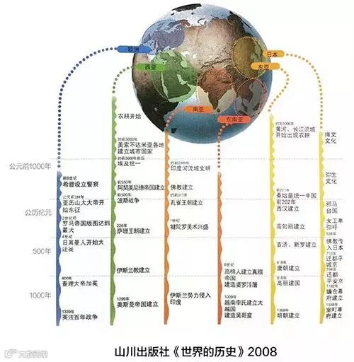 世界的历史:从地球的插图上,根据不同的区域分别抽取延长线,以此展开年表。令读者对位置产生直观印象,同时理解各区域之间的联系和历史事件的大致时间顺序。