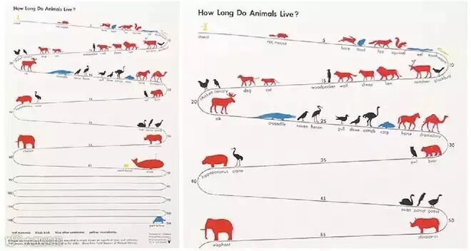 How Long Do Animals Live:通过线的引导聚集视觉焦点,让读者很流畅的浏览,图中的动物都处理成沿曲线行走的方向,方向性更加强烈。