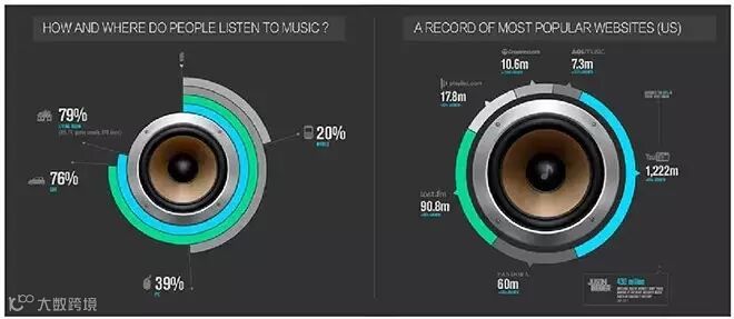 The Fragmented World Of Digital Music:一组音乐相关的数据,通过将数据和音箱喇叭的图形组合,使读者能自然而强烈的感知到作者要传达的主题是音乐相关的。平面设计中也有相关理论,这是设计中经常用到的手法。